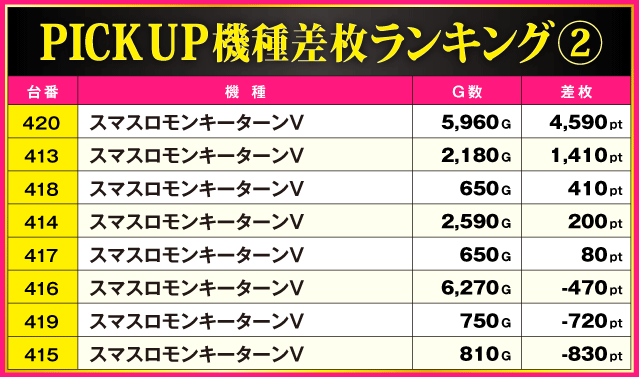 次にPICK UP機種の状況をチェック!! ランキングを制した『沖ドキ!ゴージャス』は最終的に全6台中5台がプラス差枚で実戦を終える見事な結果に。また、『スマスロモンキーターンV』からは+4,590pt、『パチスロ からくりサーカス』からは+3,410ptが確認されており、それぞれのシマは常に活気に満ち溢れる一日となった。