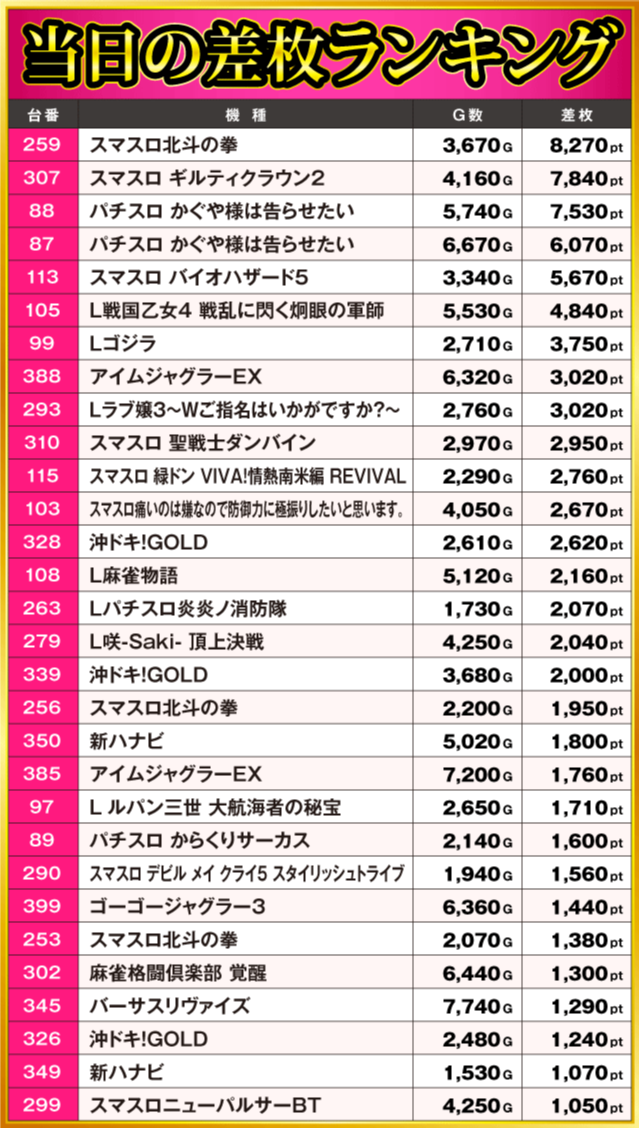 当日の差枚ランキング