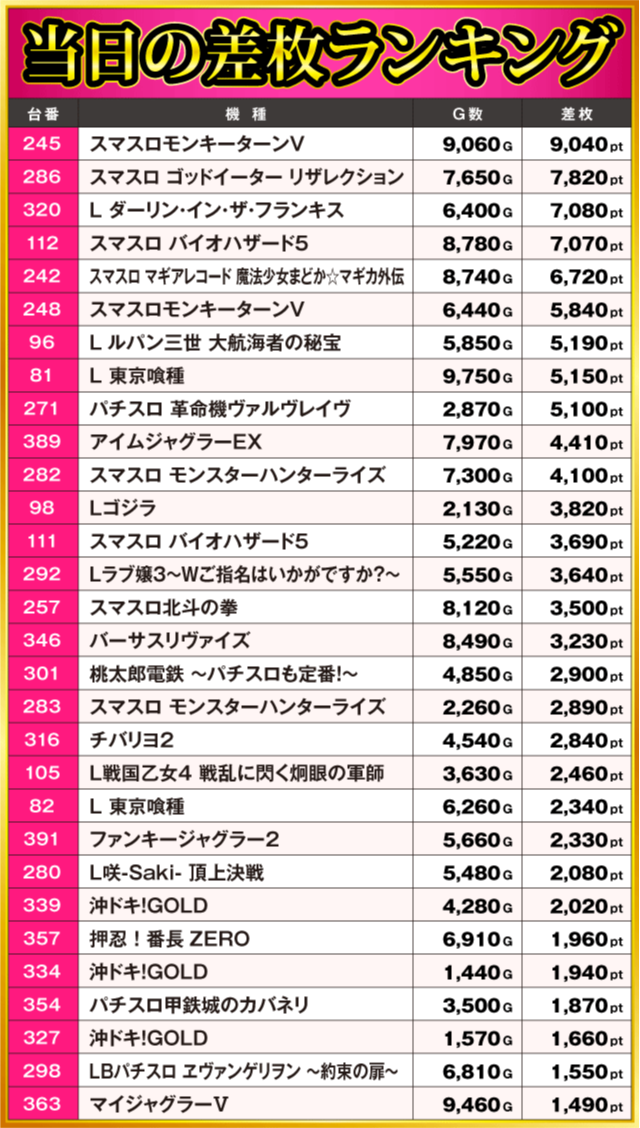 当日の差枚ランキング
