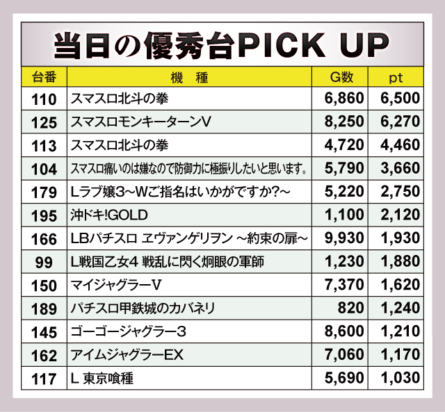 定番人気機種の『スマスロ北斗の拳』と『スマスロモンキーターンV』からは、それぞれ6,000ptオーバー台が誕生。いずれもしっかり回された台が結果をだしているようだ。