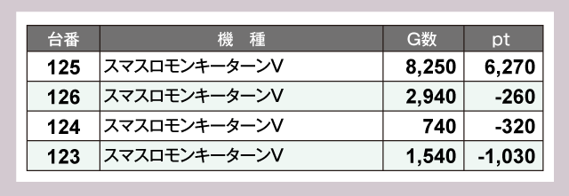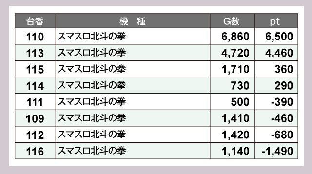 『スマスロ北斗の拳』110番台が+6,500pt、『スマスロモンキーターンV』125番台が+6,270ptと大きな成果をあげていた。つづいて『スマスロ北斗の拳』113番台が+4,460pt、『スマスロ痛いのは嫌なので防御力に極振りしたいと思います。』104番台が+3,660ptで並ぶ。他にも『Lラブ嬢3〜Wご指名はいかがですか?〜』179番台の+2,750ptなど、優秀台があちらこちらで散見された1日だった。
