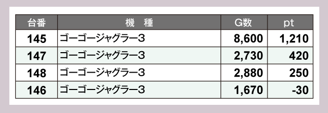『ジャグラー』シリーズから『ゴーゴージャグラー3』をピックアップ。4台中3台がプラスptと、バツグンの安定感を発揮している。