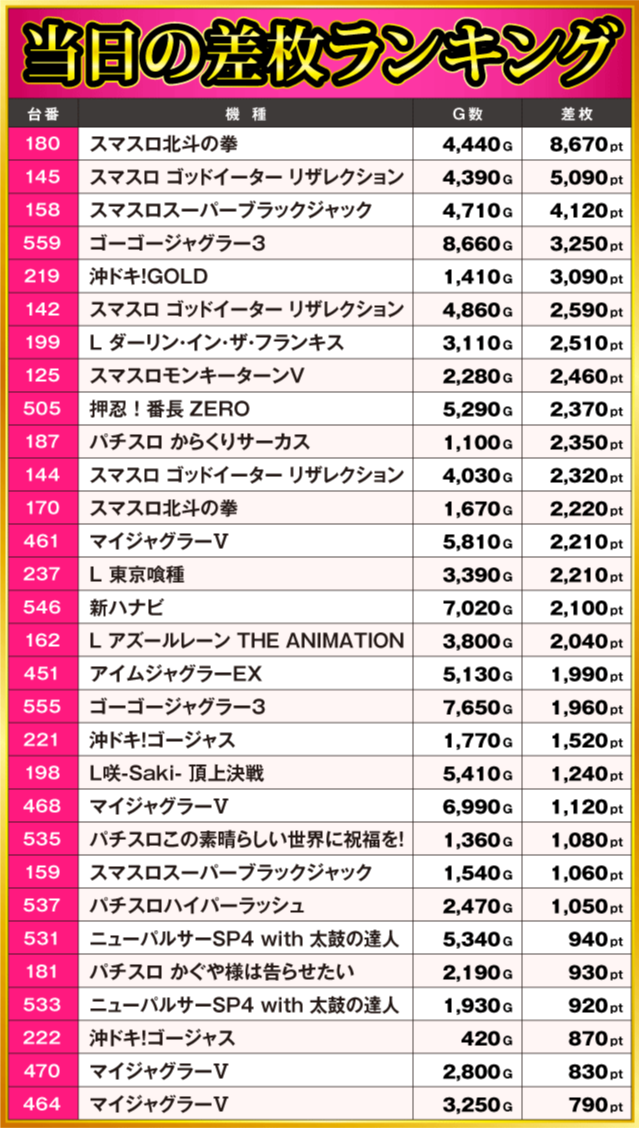 当日の差枚ランキング