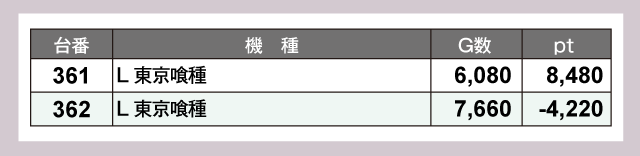 とくに目立っていたのは『戦国コレクション5超極楽LOOP』。470番台が+10,090ptと圧巻の結果を見せてくれた。そして『L 東京喰種』361番台が+8,480pt、『L ToLOVEるダークネス』443番台が+8,020ptとつづく。以下にも『パチスロ からくりサーカス』380番台の+5,310pt、『スマスロ北斗の拳』387番台の+5,300ptなど、誰もがうらやむような好成績の台があちらこちらで誕生していた。