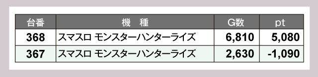人気の『L 東京喰種』と『スマスロ モンスターハンターライズ』からは8,000pt・5,000pt超えが飛びだし、ポテンシャルを十分に発揮していた。