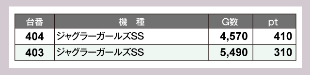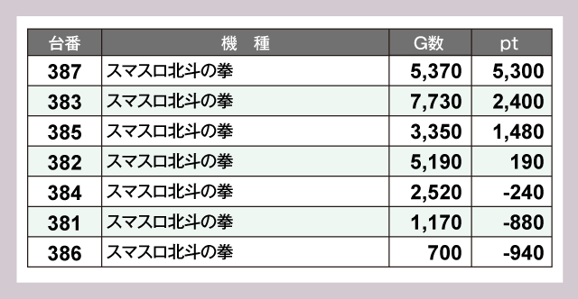 定番の『スマスロ北斗の拳』は7台中4台がプラスpt。『ジャグラーガールズSS』は2台ともがプラスと安定感を示している。