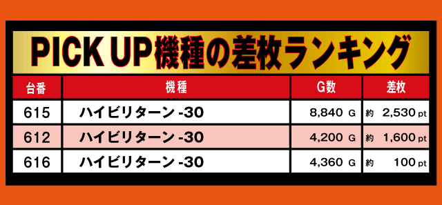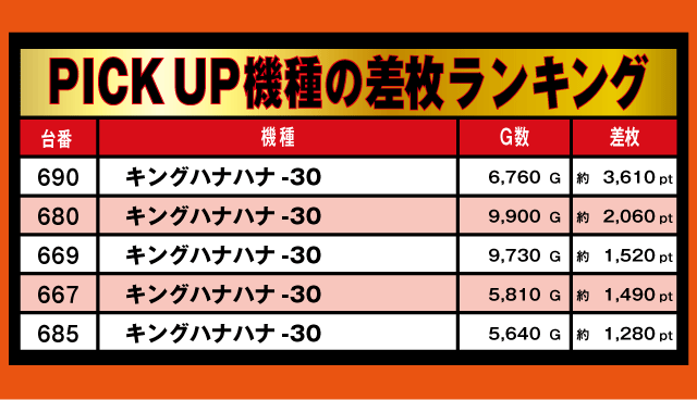 『ハイビリターン-30』は10台中3台がプラスで終了。『キングハナハナ-30』からは690番台が+3,610ptと優秀な結果を残していた。