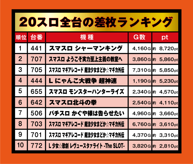 この日特に目立っていたのは『スマスロ シャーマンキング』。441番台が+8,720ptと理想的な展開を迎えていた。さらに『スマスロ ようこそ実力至上主義の教室へ』や『スマスロ マギアレコード 魔法少女まどか☆マギカ外伝』、『L にゃんこ大戦争 超神速』が+5,000pt超など、優秀台が多数誕生していた。