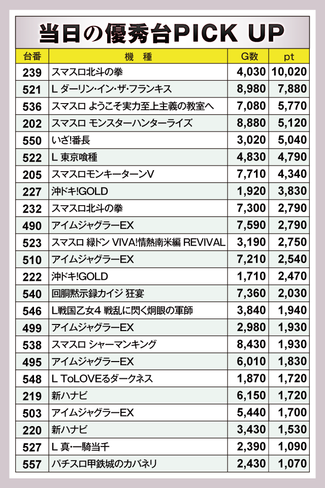 頭ひとつ抜けだしたのは『スマスロ北斗の拳』。239番台が+10,020ptと大台を突破していた。そして『L ダーリン・イン・ザ・フランキス』521番台が+7,880ptでつづく。さらに『スマスロ ようこそ実力至上主義の教室へ』536番台の+5,770pt、『スマスロ モンスターハンターライズ』202番台の+5,120pt、『いざ!番長』550番台の+5,040ptなど優秀台が多数誕生していた。