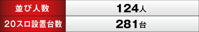 この日も朝から124人のプレイヤーが集結。開店と同時にスロットコーナーは大きな盛り上がりをむかえていた。どのようなデータを見せてくれるのか、ワクワクしながら振りかえっていくとしよう。