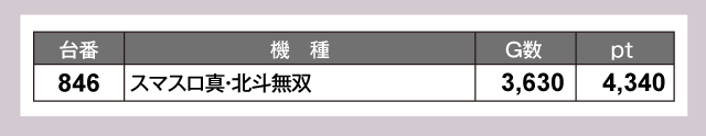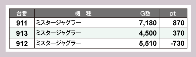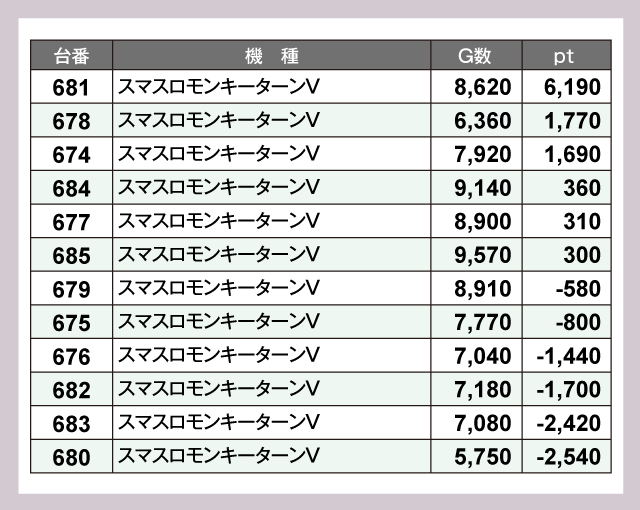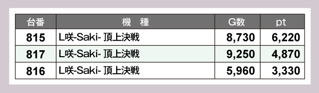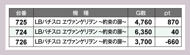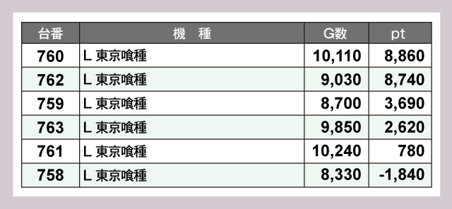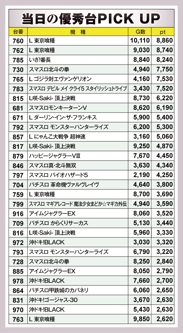 『L 東京喰種』760番台が+8,860pt、762番台が+8,740pt、さらに『いざ!番長』785番台が+8,240ptと8,000ptオーバーが3台も並んでいる。ほかにも『スマスロ北斗の拳』730番台の+7,750pt、『L ゴジラ対エヴァンゲリオン』765番台の+7,530ptなどなど、誰もがうらやむ成績の台がひしめき合うデータとなっていた。
