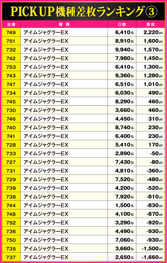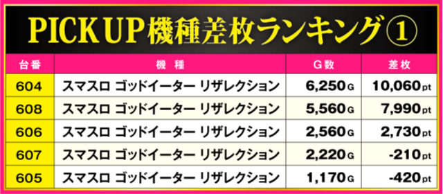次にPICK UP機種の状況をチェック!! ランキングを制した『スマスロ ゴッドイーター リザレクション』は、最終的に全5台中3台がプラス差枚となる見事な結果を残した。また、『LBパチスロ ヱヴァンゲリヲン ~約束の扉~』は+3,190ptを記録。そして、看板機種の一つである『アイムジャグラーEX』もプラス差枚台が大量発生しているだけに、それぞれのシマは常に活気に包まれる一日となった。