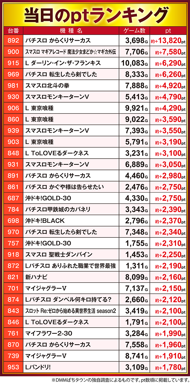 「パチスロ からくりサーカス」の4台が約+1,000pt以上。
