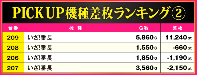 今回のPICK UP機種は差枚上位にランクインした3機種。ハイスコアが飛び出しただけでなく、3機種トータルの全13台中6台がプラス差枚で実戦を終える見事な結果を残しているだけに、ファンにとって充実の一日となったのは間違いないだろう。
