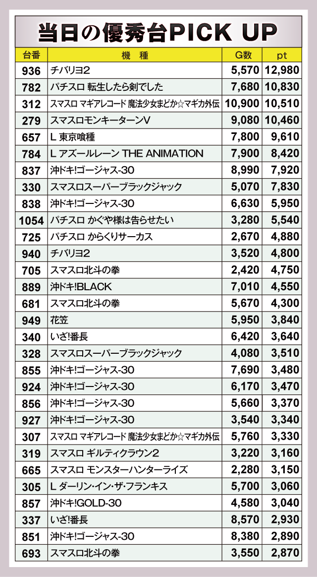 非常に高水準のpt争いが展開されていたこの日。『チバリヨ2』936番台が+12,980ptで頭ひとつぬけた好成績をおさめた。そして『パチスロ 転生したら剣でした』782番台が+10,830pt、『スマスロ マギアレコード 魔法少女まどか☆マギカ外伝』312番台が+10,510pt、『スマスロモンキーターンV』279番台が+10,460ptとつづく。以下にも『L 東京喰種』657番台の+9,610ptなどなど、スロット好きなら誰もがうらやむような結果がズラリと並んでいた。