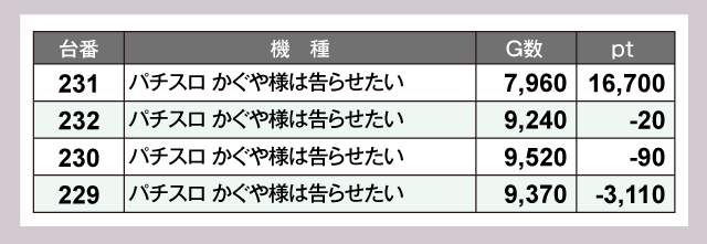 4台設置の『パチスロ かぐや様は告らせたい』からは231番台が1万pt超えを達成。『いざ!番長』は稼働が高く、ptの面でも大きなプラスを叩きだしている。