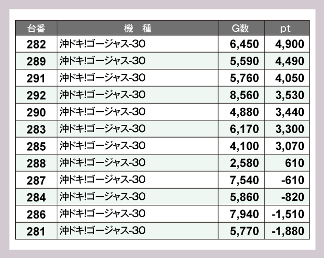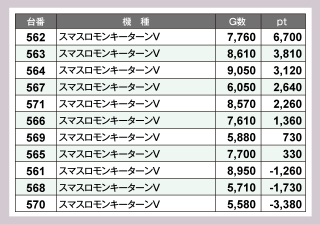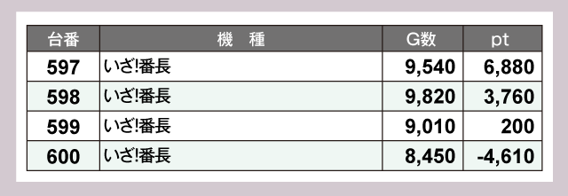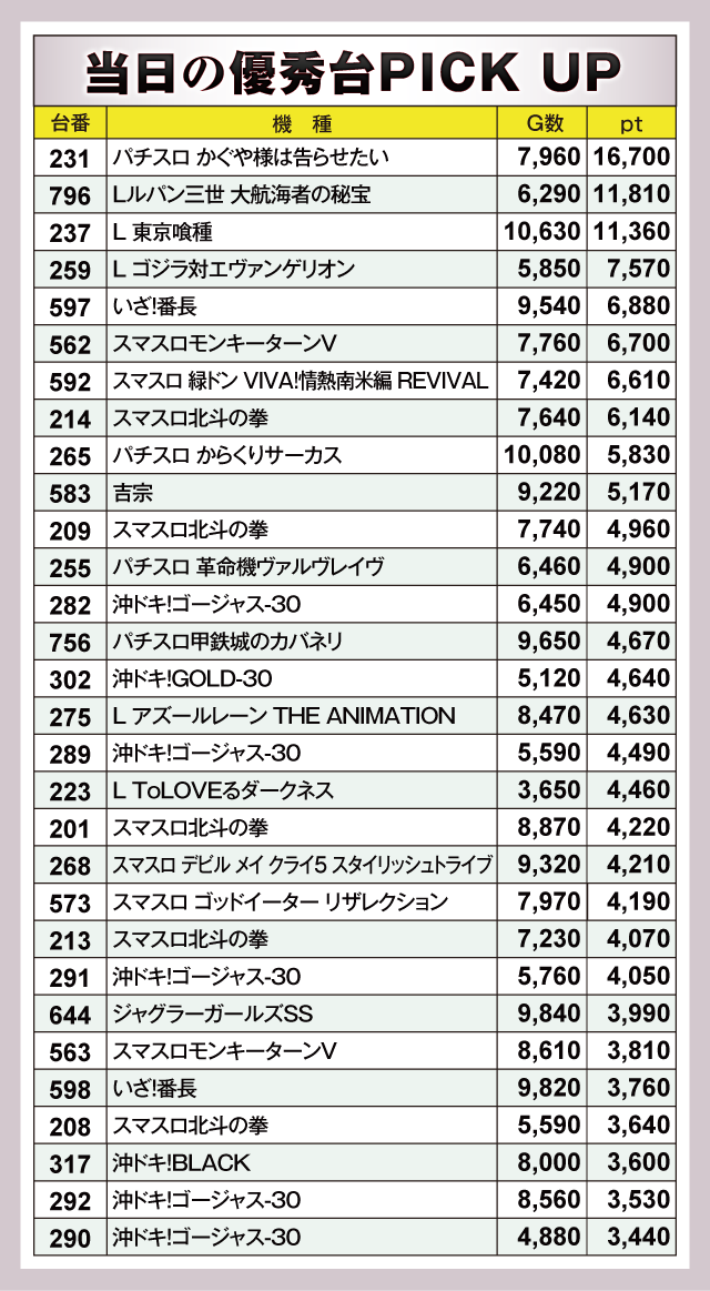突出した成績を残したのは3台。『パチスロ かぐや様は告らせたい』231番台が+16,700pt、『Lルパン三世 大航海者の秘宝』796番台が+11,810pt、『L 東京喰種』237番台が+11,360ptと見事に1万ptを達成していた。そして『L ゴジラ対エヴァンゲリオン』259番台の+7,570pt、『いざ!番長』597番台の+6,880ptとつづき、優秀台がズラリと並ぶ非常に見応えのあるデータが出来あがっている。
