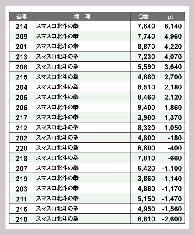 定番機種の『スマスロモンキーターンV』は+6,700pt含む8台がプラスpt。『スマスロ北斗の拳』は1,000ptオーバーが11台誕生するなど、いずれも人気と実力を発揮していた。