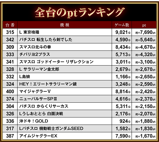 最新機種である「パチスロ 転生したら剣でした」の342番台も約+5,600ptを上回った。