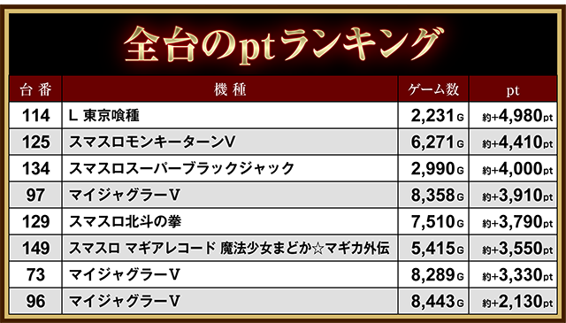 「スマスロ北斗の拳」の129番台と「スマスロ マギアレコード 魔法少女まどか☆マギカ外伝」の149番台も約+3,500ptを上回った。