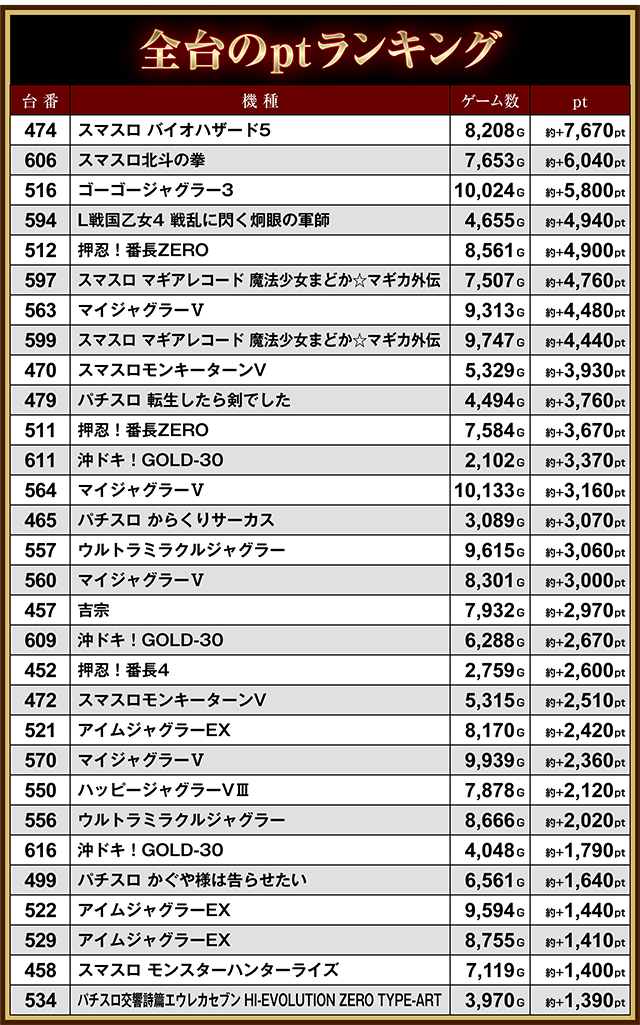 ボーナスが軸となる機種も活気があり、「ゴーゴージャグラー3」の516番台が約+5,800pt。