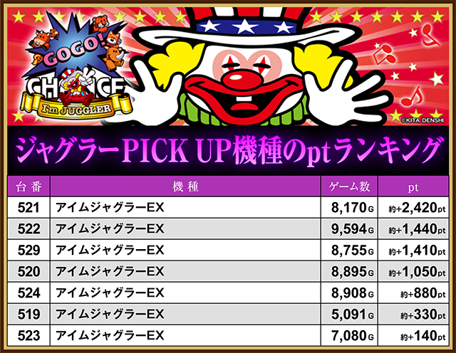 「パチンコプラザ150号店」では、「アイムジャグラーEX」の417番台が約+2,120pt。