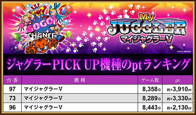 「マイジャグラーⅤ」も2台が約+1,500ptオーバーとなった。