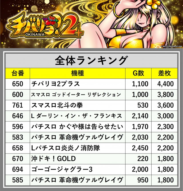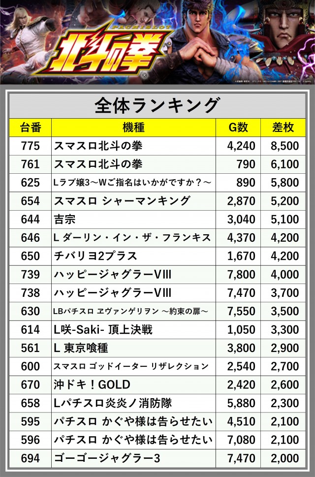 厳選された取材対象機種をはじめ、その他スロット全体から好記録が飛び出した!プレイヤーが楽しんだ1日を下記データにて振り返ってみて欲しい。