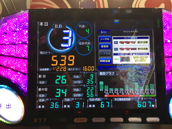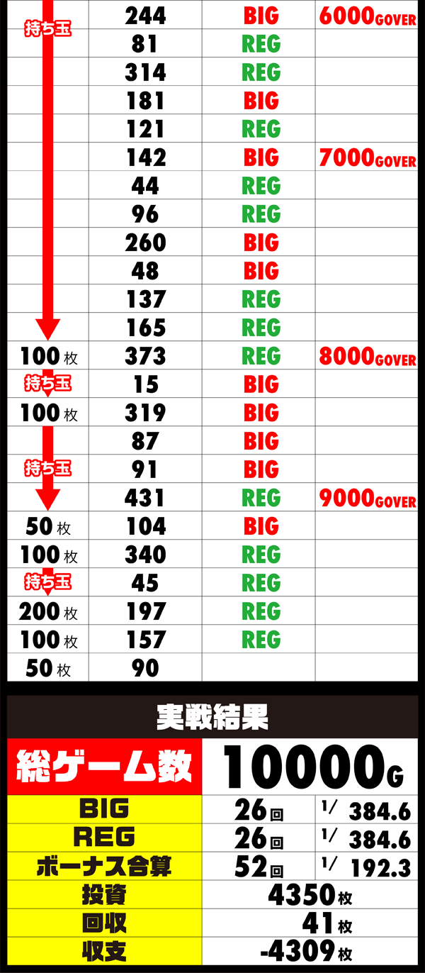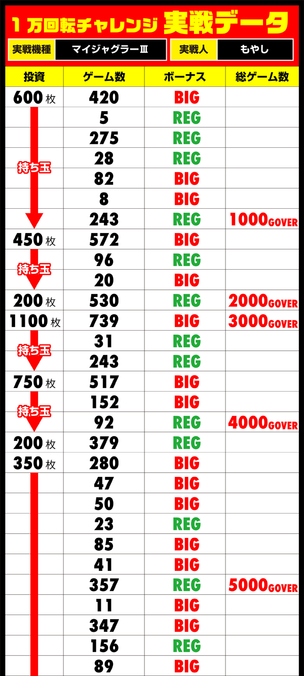 15時の時点で4100回転、18時には6400G目前と、1日を通して消化スピードは抜群の安定感をみせ、22時30分ぴったりで1万回転に到達!
