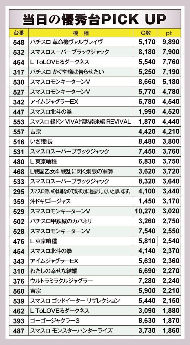 とくに目立っていたのは『パチスロ 革命機ヴァルヴレイヴ』。548番台が+9,890ptと、あわや1万ptオーバーの好成績をおさめた。そして『スマスロスーパーブラックジャック』532番台が+7,900pt、『L ToLOVEるダークネス』464番台が+7,760pt、『パチスロ かぐや様は告らせたい』317番台が+7,190ptと優秀台がつづく。そして『スマスロモンキーターンV』530番台の+5,180pt、527番台の+4,780ptなどなど、誰もがうらやむ結果がズラリと並んでいた。