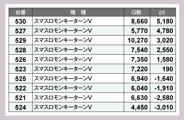 『スマスロモンキーターンV』は10台中6台がプラスptで、1万G超えもあらわれて全台が高稼働だった。