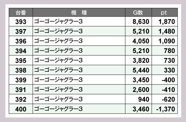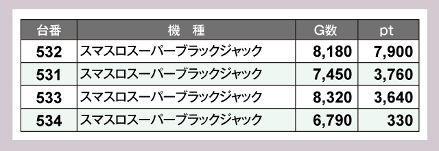 『スマスロスーパーブラックジャック』と『ウルトラミラクルジャグラー』も高G数まわされていて、全台がプラスptとなっている。