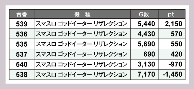 6台設置の『スマスロ ゴッドイーター リザレクション』は4台がプラス。10台設置の『ゴーゴージャグラー3』は6台がプラスで、どちらも定番人気機種としてプレイヤーを満足させていた。
