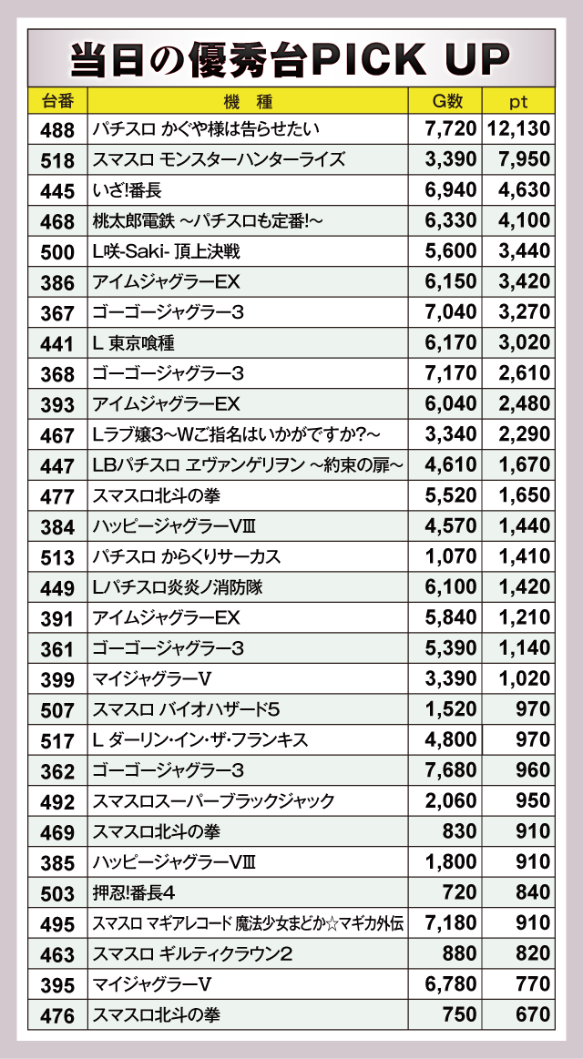 頭ひとつ抜けでた成績を叩きだしたのは『パチスロ かぐや様は告らせたい』。488番台が+12,130ptと誰もがうらやむようなptだった。そして『スマスロ モンスターハンターライズ』518番台が+7,950pt、『いざ!番長』445番台が+4,630pt、『桃太郎電鉄 ~パチスロも定番!~』468番台が+4,100ptとつづく。他にも『L咲-Saki- 頂上決戦』500番台の+3,440ptなどなど、優秀台が詰まった見応えのあるデータが出来あがっていた。