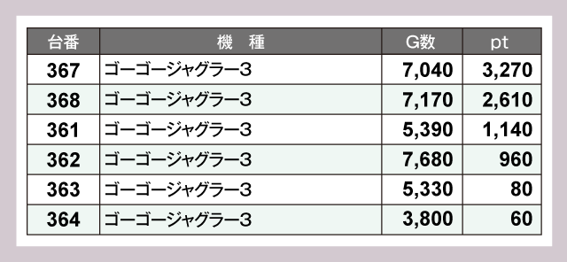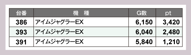 『ジャグラー』シリーズから『ゴーゴージャグラー3』と『アイムジャグラーEX』をピックアップ。安定した高稼働が見られ、優秀台も複数誕生していた。