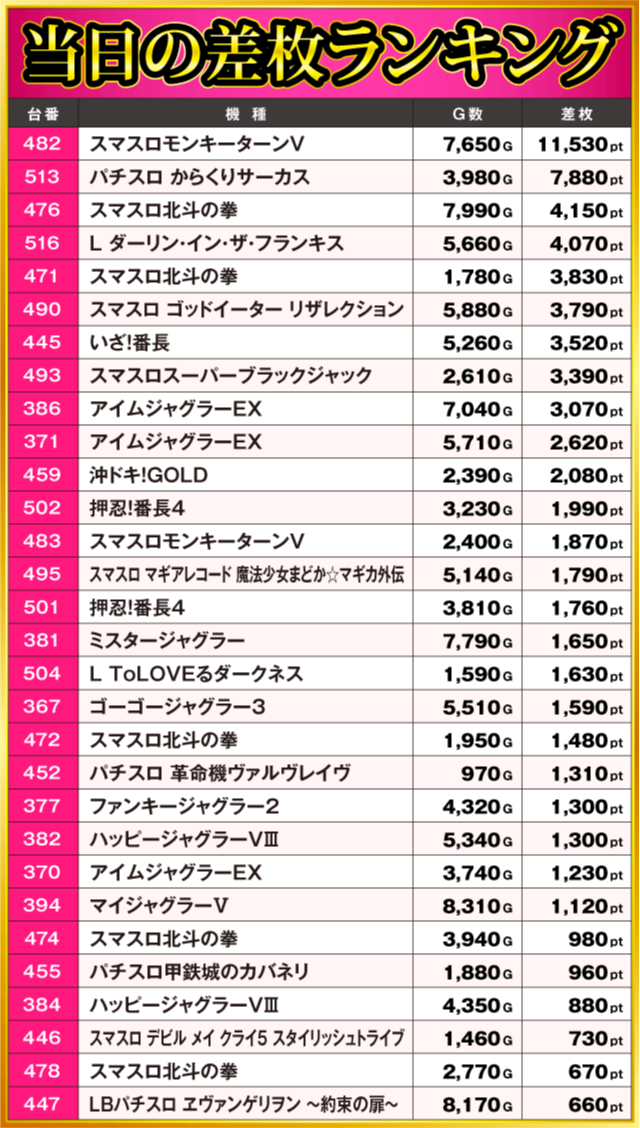 この日は、『スマスロモンキーターンV』が万枚超の+11,530ptを叩き出しランキングトップに。次いで『パチスロ からくりサーカス』が+7,880pt、『スマスロ北斗の拳』と『L ダーリン・イン・ザ・フランキス』が+4,000pt超を記録するなど、人気のスマスロを中心にハイスコアが続出し店内を盛り上げていた。
