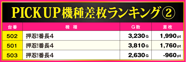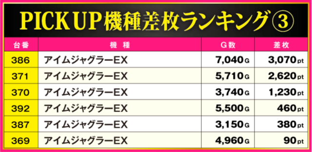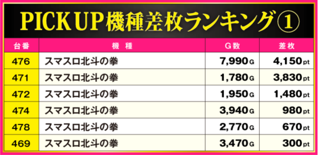 今回のPICK UP機種は全3機種。好成績を記録した『スマスロ北斗の拳』以外にも多数の好調台が確認されており、最終的に3機種トータルの全26台中14台がプラス差枚で実戦を終える見事な結果を残している。まさに、それぞれの機種のファンにとっては大満足の一日となったに違いないだろう。