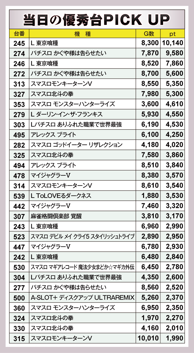 ひときわ目立っていたのは『L 東京喰種』。245番台が+10,140pt、246番台が+7,860ptと圧倒的な成績を残していた。つづいて『パチスロ かぐや様は告らせたい』274番台も+9,580ptと素晴らしい結果を叩きだしている。以下『スマスロモンキーターンV』313番台含む3台が5,000ptオーバー、『スマスロ モンスターハンターライズ』353番台含む5台が4,000ptオーバーと、華やかなデータがズラリと並んでいた。