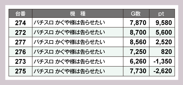 『パチスロ かぐや様は告らせたい』は6台中4台がプラスpt。いずれの台も高稼働で、この日の店内の中心的存在だった。