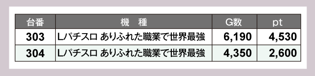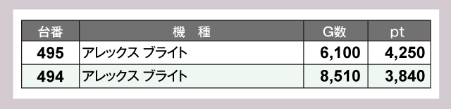 2台設置の『アレックス ブライト』と『Lパチスロ ありふれた職業で世界最強』は全台がプラスptで、優秀な打率を誇っている。