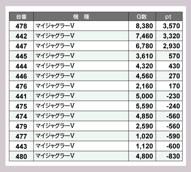『マイジャグラーⅤ』は14台中7台がプラスとなっていて、たくさんのG数を回された台も多く、定番機種としての役割を果たしていた。