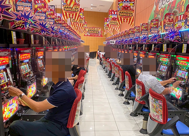 「アイムジャグラーEX」や「マイジャグラーⅤ」などがにぎわっており、多くのプレイヤーが楽しそうに遊技をおこなっていた。