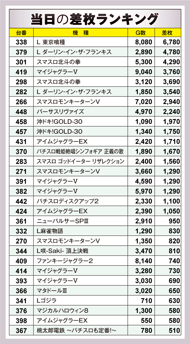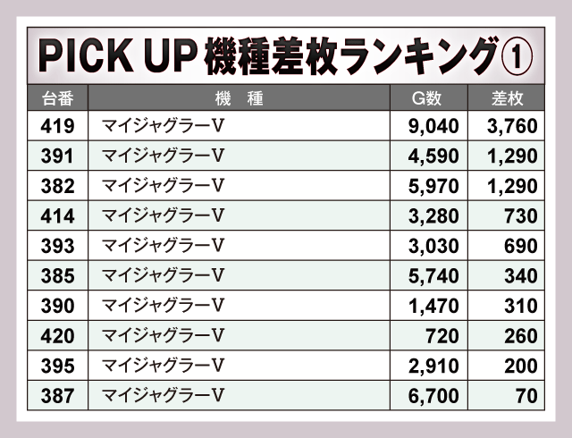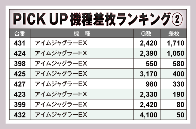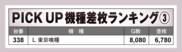 今回のPICK UP機種は全3機種で、ランキングを制した『L 東京喰種』以外では2機種のジャグラーシリーズが対象となっている。そんな中、『マイジャグラーⅤ』からは+3,760枚が発生、『アイムジャグラーEX』もプラス差枚で実戦を終えた台が大量発生しているだけに、ファンにとって充実の一日となったのは間違いないだろう。