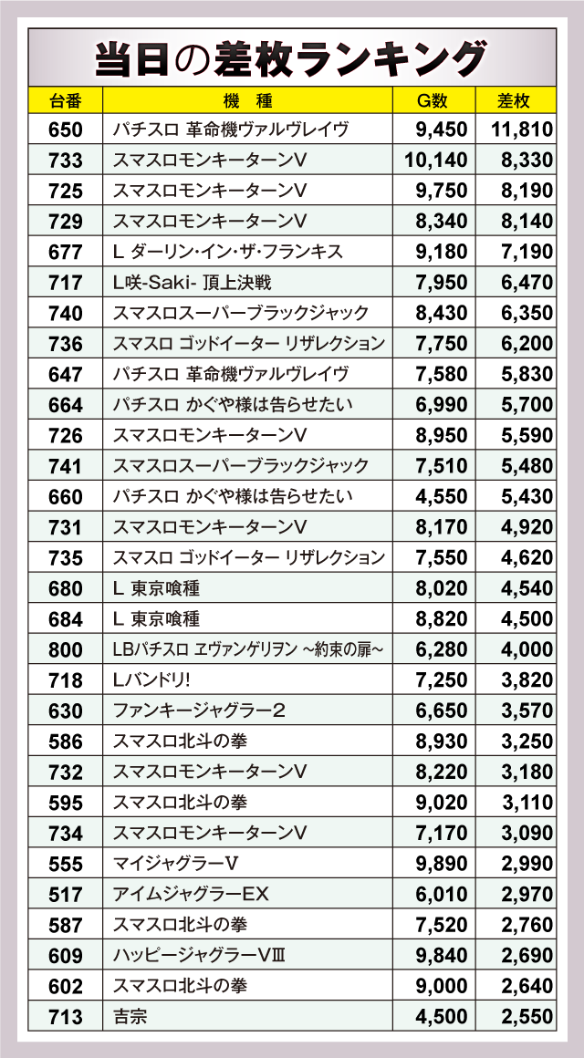 この日は、『パチスロ 革命機ヴァルヴレイヴ』が万枚超の+11,810枚を叩き出しランキングトップに。次いで『スマスロモンキーターンV』から+8,000枚超が3台も発生するなど定番の人気機種が大奮闘!! さらに、導入直後の新台『L ダーリン・イン・ザ・フランキス』が+7,190枚を記録しており、機種の新旧を問わずハイスコアが続出し店内を盛り上げていた。