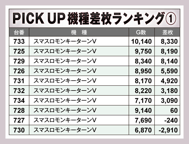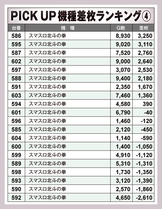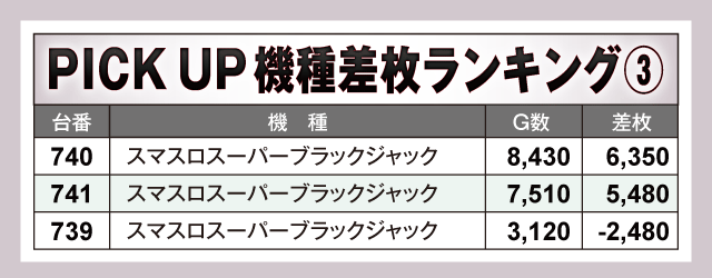 今回はPICK UP機種は山佐推し!! 好成績が続出した『スマスロモンキーターンV』は最終的に全10台中8台がプラス差枚となる見事な結果に。また、『スマスロ ゴッドイーター リザレクション』と『スマスロスーパーブラックジャック』からはともに+6,000枚超が発生している。そして、『スマスロ北斗の拳』からも大量のプラス差枚台が確認されているだけに4機種のシマは常に活気に満ち溢れる一日となった。
