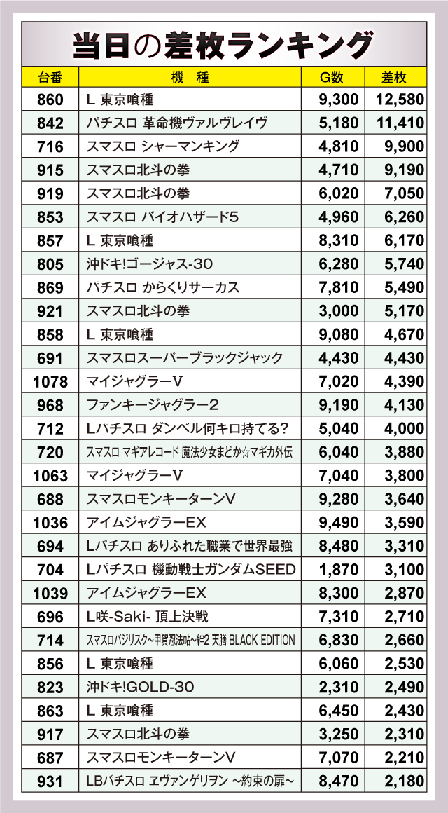 この日は、『L 東京喰種』が+12,580枚、『パチスロ 革命機ヴァルヴレイヴ』が+11,410枚を記録。さらに、『スマスロ シャーマンキング』と『スマスロ北斗の拳』が万枚目前の+9,000枚超を叩き出すなど、人気のスマスロを中心にハイスコアが続出しプレイヤーの注目を集めていた。
