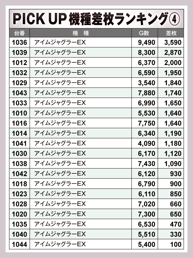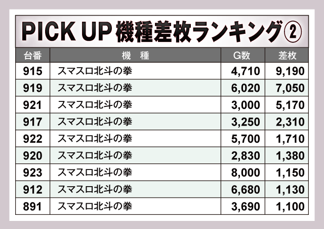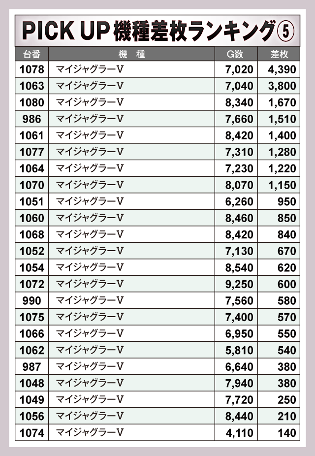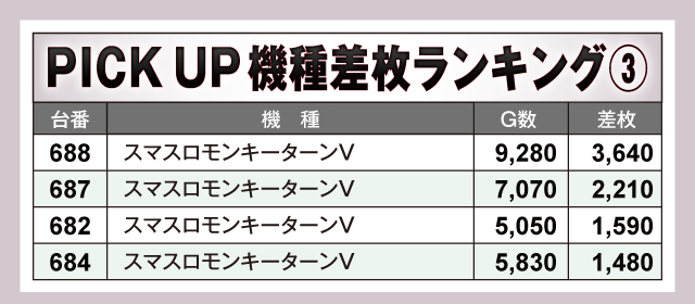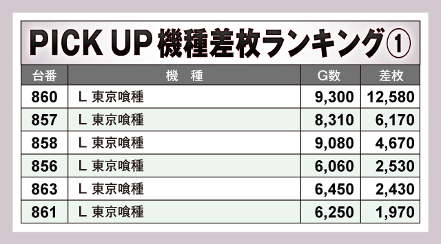 次にPICK UP機種の状況をチェック!! 差枚上位にランクインした台以外からも多数の好調台が確認されており、『L 東京喰種』からは+6,170枚、『スマスロ北斗の拳』からは+7,050枚が飛び出している。また、2つのジャグラーシリーズはプラス差枚台が大量発生する圧倒的な安定感を披露しファンを喜ばせていた。