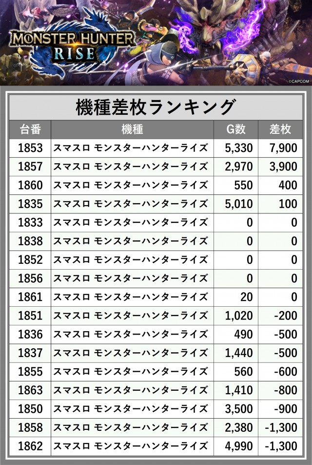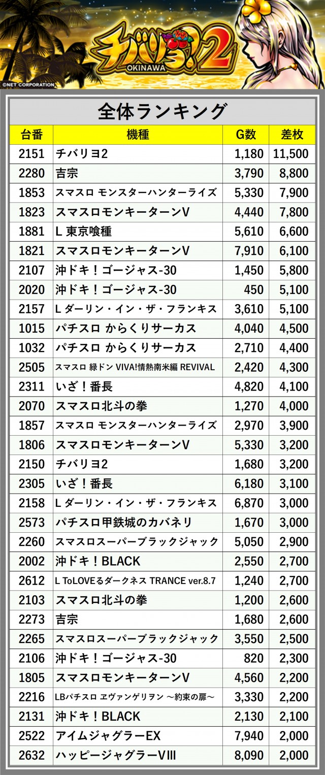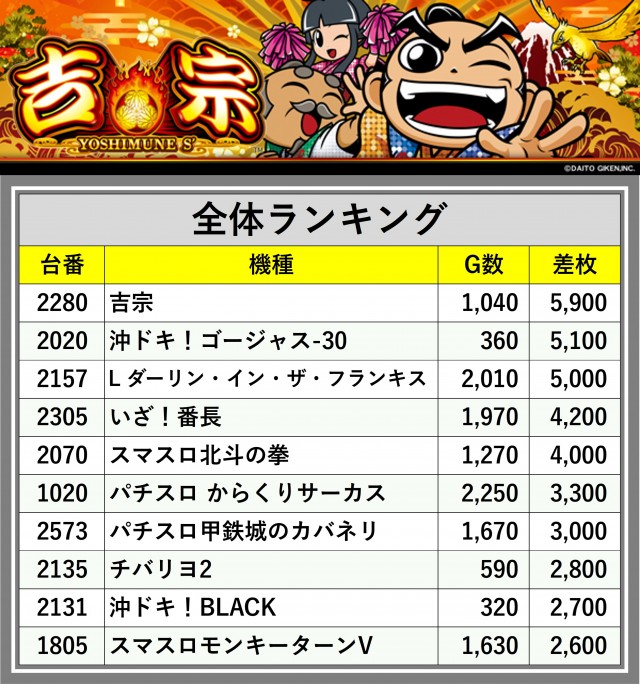 厳選された取材対象機種をはじめ、その他スロット全体から好記録が飛び出した!プレイヤーが楽しんだ1日を下記データにて振り返ってみて欲しい。