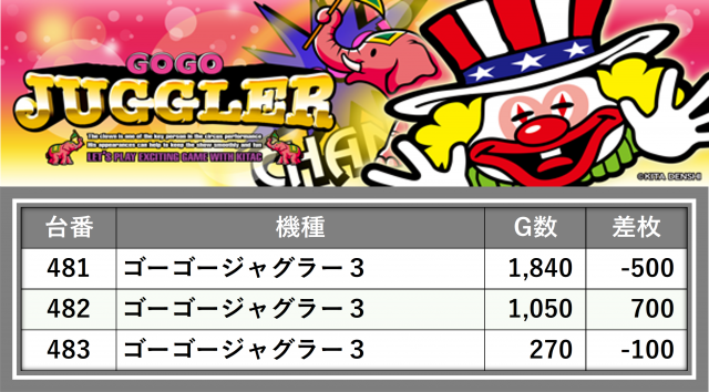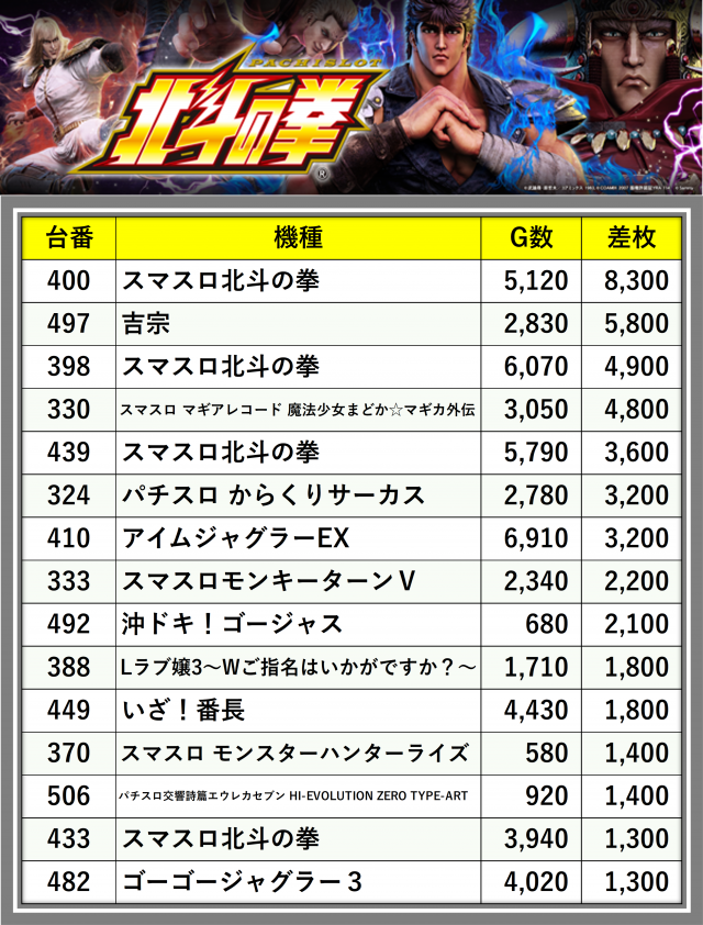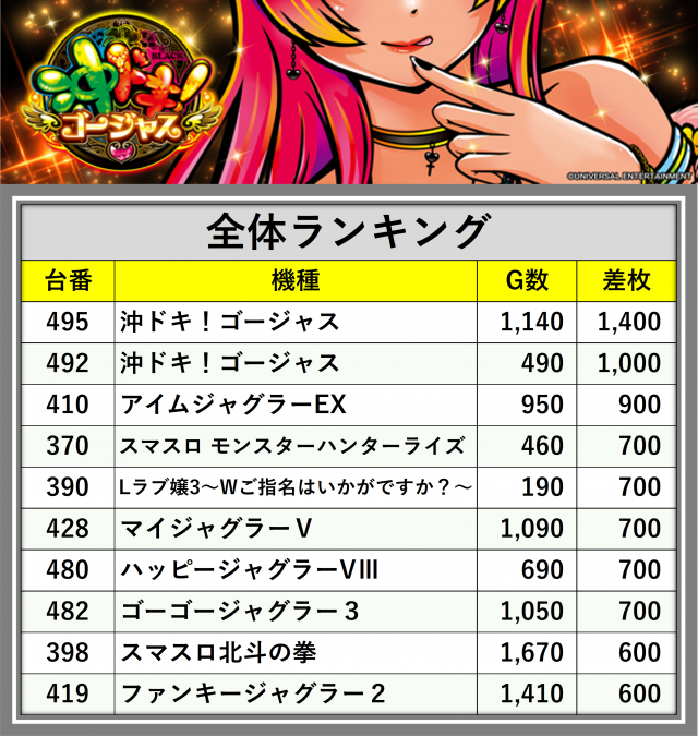 厳選された取材対象機種をはじめ、その他スロット全体から好記録が飛び出した!プレイヤーが楽しんだ1日を下記データにて振り返ってみて欲しい。