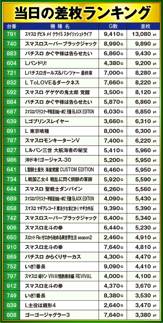 レポートの最後に「Super D’STATION金古店」の差枚ランキングも掲載!